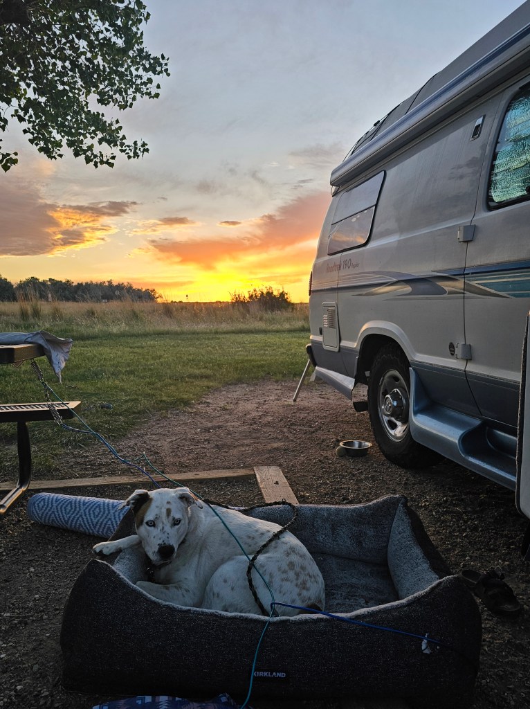 I’m in a really sucky situation. I’m waiting for my parts for my rear end to be replaced and I’m also waiting on solar panels to be ordered so we can install them. What does that really mean? It’s not super safe for me to drive or really get any where that is bumpy. And not having my solar panels working means that it is best that I have a space to charge up at. This also allows me to run my a/c on incredibly hot days, like today and tomorrow. Right now I got the back of the van at 69 degrees! Everest is LOVING it. She keeps looking back at me like “Is this real?” and then she falls back asleep.